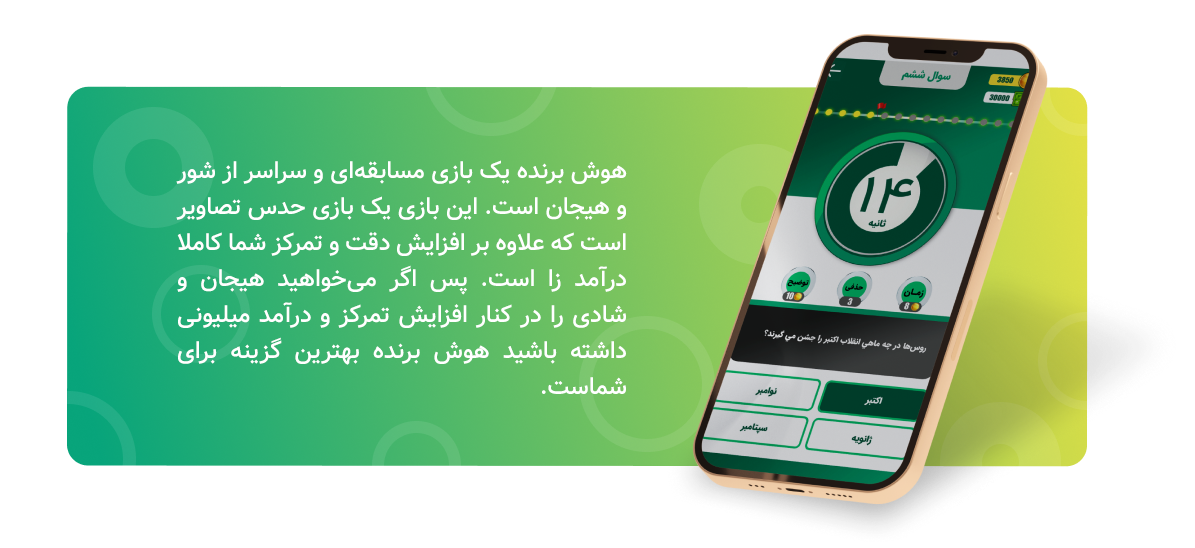 هوش برنده رقابتهایی سراسر شور و هیجان آمیخته با لذت رسیدن به جوایز میلیونی است در این بازی رقابت به طور واقعی معنا میشود و میتوان آن را حس کرد.
